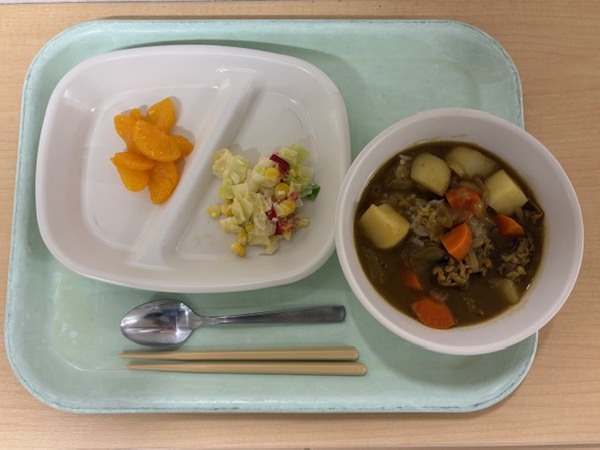 メニューはカレーライス・キャベツサラダ・みかん缶です。