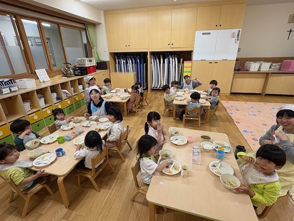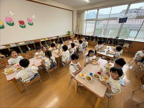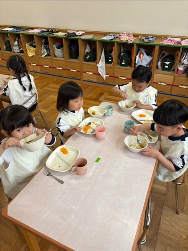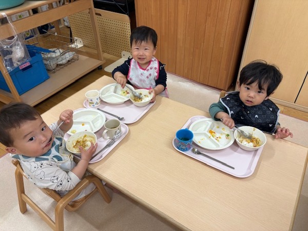 はじめての給食は、緊張や不安な気持ちがある中で食べている子もいましたが、日々過ごしながら園が安心できる場所となり、給食もお楽しみの時間となりますように…